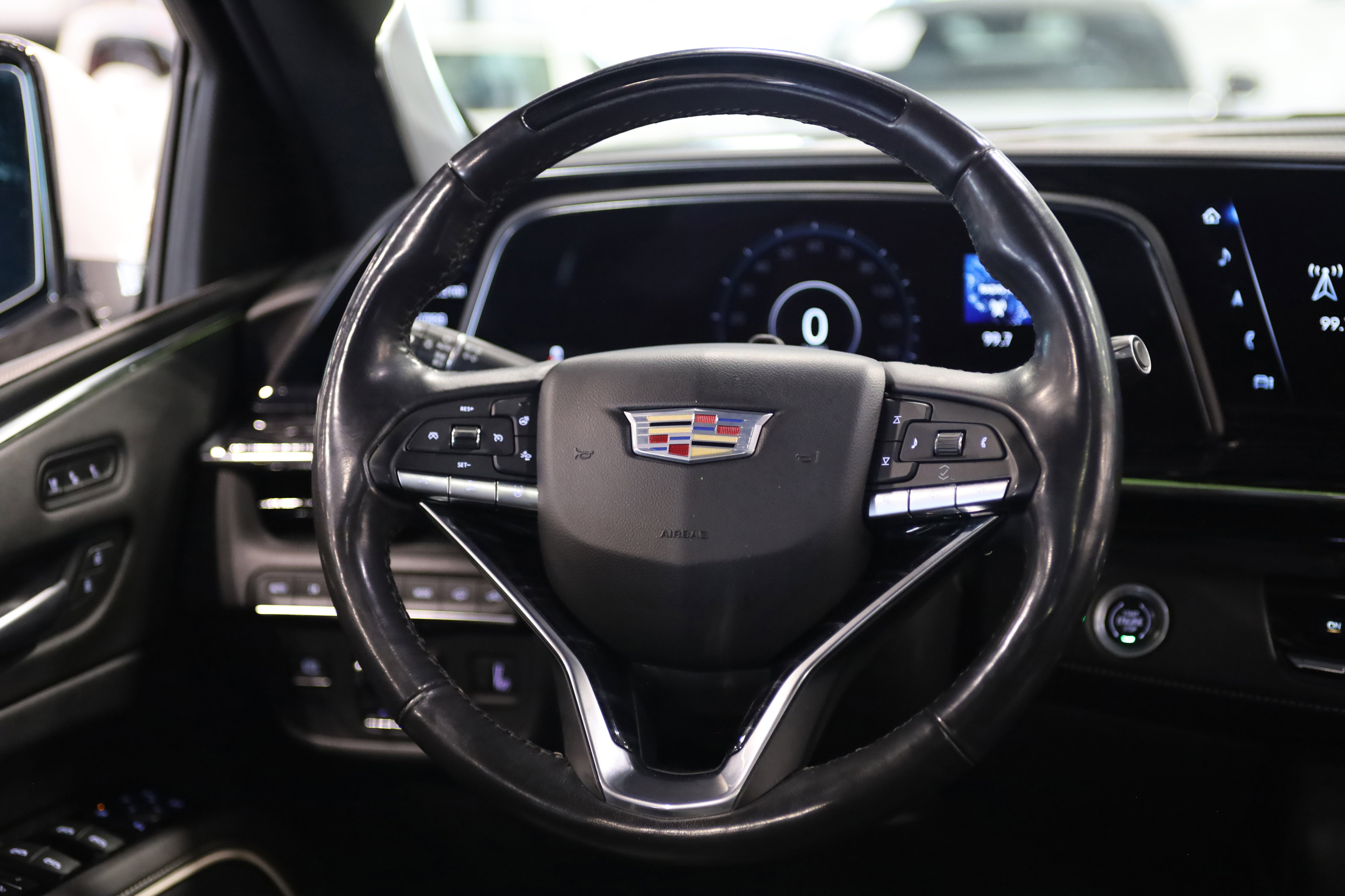 The interior showcases Cadillac's signature innovation with a stunning OLED curved display system, augmented reality navigation, head-up display, and an incredible 36-speaker AKG Studio Reference audio system. Comfort features include heated and ventilated front seats, heated second-row seats, power-folding third row, tri-zone automatic climate control, wireless Apple CarPlay and Android Auto, wireless phone charging, panoramic power sunroof, rear seat entertainment, and soft-close doors.